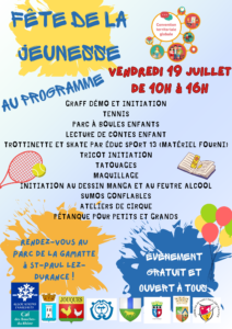 PROGRAMME DU WEEK-END 19.07.2024 Imprimer Share 0 Email Un week-end festif vous attend dès aujourd’hui ! Fête de la Jeunesse Vendredi 19 Juillet de 10h à 16h Le Festival Polynésien Du Mercredi 17 Juillet au Dimanche 21 Juillet La Soirée Mousse Samedi 20 Juillet à partir de 19h 2024-07-19 Adminmairie1